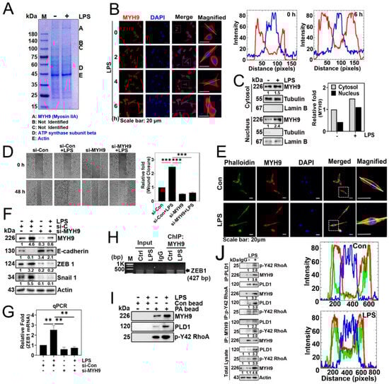 As a result, our objective was to investigate and identify the proteins that interact with phosphatidic acid (PA) in the downstream signaling pathway activated by LPS. We utilized PA-conjugated beads to capture proteins from the lysates of the A549 cells stimulated with LPS. This approach led to the identification of MYH9, also referred to as Myosin IIA, non-muscle myosin IIA (NMIIA), and ATP synthase β as the protein bound to the PA-conjugated beads (Figure 5A). Notably, MYH9 (Myosin IIA) was observed to increase in response to LPS (Figure 5B,C), and exhibited localization in both the cytosol and the nucleus, with a preference for the cytosol (Figure 5C). Subsequently, we noted an LPS-induced elevation of MYH9 in the nucleus (Figure 5C). Subsequently, we investigated the effect of MYH9 on cell migration, and found that the knockdown of MYH9 with siRNA suppressed cell migration (Figure 5D). Moreover, MYH9 co-localized with F-actin, and the levels of both the MYH9 and F-actin in the nucleus were elevated in response to LPS (Figure 5E). Previously, myosin IIA (MYH9) has been documented to be associated with cell migration, metastasis, and the EMT process [21]. In line with these results, the knockdown of MYH9 with siRNA led to an increase in E-cadherin expression and a decrease in ZEB1 and Snail1 levels (Figure 5F). To confirm this result, we determined the level of ZEB1 mRNA. Si-MYH9 significantly prevented ZEB1 mRNA levels (Figure 5G). Notably, we observed MYH9 binding to the ZEB1 promoter via ChIP-PCR, regardless of LPS stimulation (Figure 5H). This result suggests that MYH9 may be involved in the regulation of ZEB1 expression. Furthermore, in lysates of A549 cells stimulated by LPS, we observed the association of PA-conjugated beads with MYH9, PLD1, and p-Tyr42 RhoA (Figure 5I). Consistent with this result, PLD1 co-immunoprecipitated with p-Y42 RhoA and MYH9, p-Y42 RhoA co-immunoprecipitated with MYH9 and PLD1, and MYH9 co-immunoprecipitated with PLD1 and p-Y42 RhoA (Figure 5J). These results indicate that PA/MYH9/PLD1/p-Y42 RhoA form a complex in response to LPS.