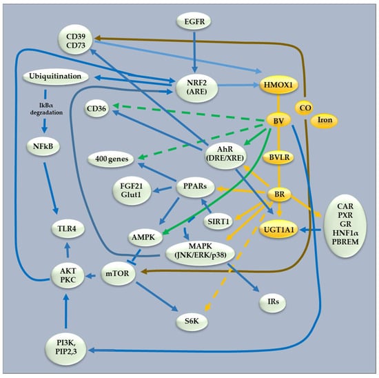 Interconnections between heme metabolism and signaling pathways. Solid line: experimental evidence of a direct link. Dash lines: no experimental evidence of a direct action. Green lines: biliverdin action; yellow lines: bilirubin actinin; brown lines: CO action; blue lines: all other actions/connections. Yellow EFGR: epidermal growth factor receptor; NRF2: nuclear factor erythroid 2–related factor 2; ARE: antioxidant response element; CD: cluster of differentiation; HMOX: heme oxygenase; BV: biliverdin; BVLR: biliverdin reductase; BR: bilirubin; UGT1A1: UDP-glucuronosyltransferase 1A1; CAR: constitutive active/androstane receptor; PXR: pregnane X receptor; GR: glucocorticoid receptor; AhR: aryl hydrocarbon receptor; DRE/XRE: drought/xenobiotic-responsive elements; HNF1: hepatocyte nuclear factor 1α; PBREM: phenobarbital (PB)-responsive enhancer module; PPAR: peroxisome proliferator-activated receptor; SIRT: silent information regulator; MAPK: mitogen-activated protein kinase; JNK: Jun kinase; ERK: extracellular signal-regulated kinase; mTOR: mechanistic Target of Rapamycin; AMPK: AMP-activated protein kinase; AKT: protein kinase B; PKC: protein kinase C; TLR4: toll-Like receptor 4; NFkB: nuclear factor-κB; PIP: phosphatidylinositol biphosphate; PI3K: phosphatidylinositol-3-kinase; IRs: insulin receptor; S6K: protein S6 kinase; FGF: fibroblast growth factor; Glut1: glucose transporter type 1.
