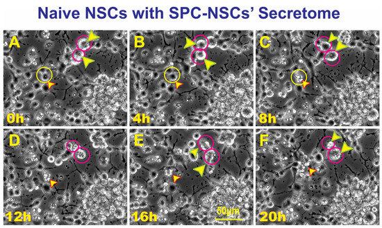 Unveiled effects of SPC-NSC-secretome on enhanced ALB in naïve NSCs. Sequential views of the behavior of naïve NSCs incubated in a culture medium containing the secretome produced by NSCs flown to space. The cultures were examined to identify cells undergoing ALB. Once a cell was identified, it was then studied through reverse-time tracking. At the beginning of the time-lapse acquisition, the cells looked round and healthy. Note that at least three instances of ALB are observed in the field of view. (A) View of a cell of interest 13.25 h after the beginning of the time-lapse study. Yellow circle and arrow, in the same field two larger cells labeled with red circles and arrows. (B) Morphological changes observed, the cell encircled in yellow looks healthy and still bearing cell processes. The two larger cells encircled in red look rounder and healthy as well; (C) after 8 h following the start of the time-lapse, the cell had expelled material from its soma (yellow circle). The two cells inside red circles were less round and still looked healthy. (D) In the span of four hours, the cell in the top red circle had expelled some of its contents onto the extracellular space while the one in the bottom circle looked ruffled. (E) Another 4 h later, the cell in the top red circle appears to have internalized the expelled material, while the cell below that one had become larger. (F) The cell then collapsed and became just a small pocket-like structure. The total duration of this event was 20 h. Video time-lapse of this event is shown in Video S3.