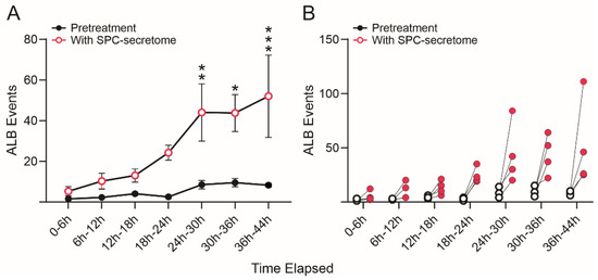 SPC-NSCs-produced secretome enhanced ALB in naïve NSCs. Comparison of the number of ALB events in naïve NSCs in STM medium alone and naïve NSCs grown in medium containing STM + the secretome of SPC-flown NSCs (2:1 v/v). We found that ALB was upregulated in NSCs treated with the secretome of SPC-NSCs since the beginning of the time-lapse. Untreated naïve NSC cultures had a very low number of cells undergoing ALB starting with 1 to 2 cells in the first 12 h, increasing to an average of 5 to 9 cells until the end of the study 44 h later. (A) The graph represents the average number of events observed in the 4 samples examined before and after exposure to the secretome medium. (B) The graph shows individual changes in the number of ALB events before (black open dots) and after (red dots) changing to the secretome-containing medium. Statistical analysis was performed using Two-way Repeated Measures ANOVA and the interaction time × pretreatment × secretome was highly significant (p = 0.0065, F(6, 18) = 4.418). Tukey’s multiple comparisons post hoc test demonstrated statistically significant increases at the 24–30 h (p = 0.0088), 30–36 h (p = 0.0123) and (p = 0.001) bins. Asterisks indicate the level of statistical significance with * p < 0.05, ** p < 0.01 and *** p < 0.001.