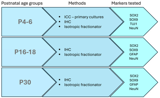 Schematic representation of the experimental design. Three different age groups were used. Immunostaining with different marker combinations was performed for all age groups by immunohistochemistry (IHC) or isotropic fractionator. Immunocytochemistry (ICC) was performed on primary dissociated cortical cultures derived from P4-6 opossum pups.