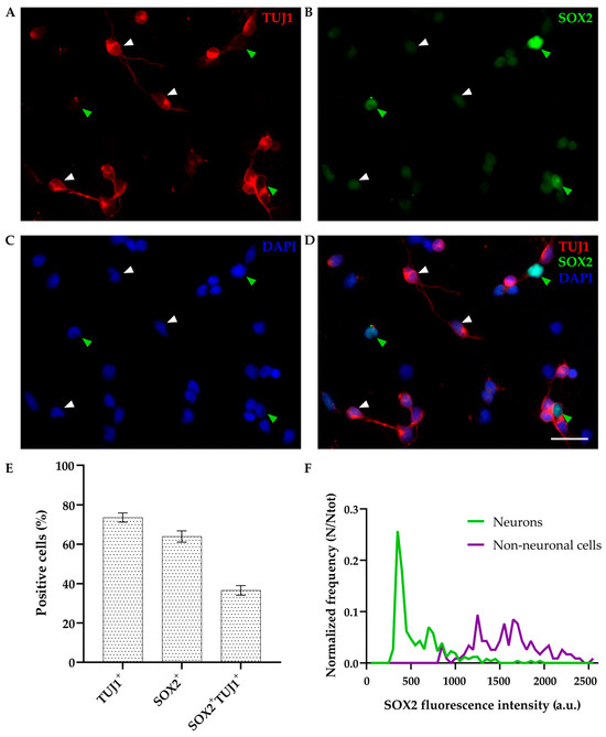 As expected, SOX2 was detected in non-neuronal (TUJ1-negative) cells, showing bright staining and nuclear localization (Figure 2, green arrowheads); 63.96 ± 2.84% of cells were SOX2-positive while 73.55 ± 2.33% were positive for TUJ1 (out of 559 cells analyzed, Figure 2E). Interestingly, SOX2 was also coexpressed in 49.76 ± 2.99% of TUJ1-positive neurons (as indicated by white arrowheads in Figure 2), and these double-positive cells represented 36.56 ± 2.46% of total cells (n = 559, Figure 2E). Coexpression of SOX2 with an additional neuronal marker (NeuN) at DIV1 was confirmed as well (Supplementary Figure S3).