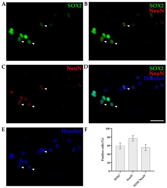 P6 cortex of Monodelphis domestica processed by an isotropic fractionator. Obtained nuclei were stained for SOX2 ((A), green), NeuN ((B), red), and Hoechst 33,342 ((C), blue) and imaged using a 60× 1.42 NA oil immersion objective. Images are projections of a 10 µm z-stack acquired with 0.25 µm steps. (D) Merging of SOX2 and NeuN stainings. (E) Merging of SOX2, NeuN, and Hoechst 33,342 stainings. Examples of double-positive (SOX2/NeuN) nuclei are shown by arrowheads. (F) Bar graph showing the percentage of positive cells for SOX2 and NeuN compared to the total cells (Hoechst 33342+, n = 892). Scale bar, 25 µm.