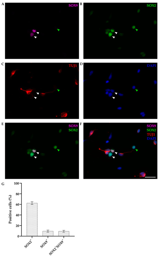 SOX9 was exclusively stained in non-neuronal cells (TUJ1-negative), accounting for 11.47 ± 1.68% of total cells (n = 303), and it was always coexpressed with SOX2 (Figure 5E–G). However, not all non-neuronal cells were SOX9-positive (as indicated by the green arrowhead in Figure 5). Since P4-6 opossums correspond to late mouse or rat embryos, based on these results, we can conclude that at this stage, neural stem/progenitor cells are a heterogeneous cell population [45,46] expressing SOX2, with SOX9 limited to a subset of neural stem cells.