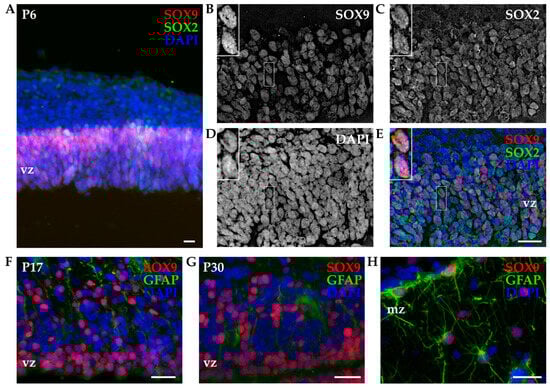 - Scott, C.E.; Wynn, S.L.; Sesay, A.; Cruz, C.; Cheung, M.; Gomez Gaviro, M.-V.; Booth, S.; Gao, B.; Cheah, K.S.E.; Lovell-Badge, R.; et al. SOX9 Induces and Maintains Neural Stem Cells. Nat. Neurosci. 2010, 13, 1181–1189. [Google Scholar] [CrossRef] [PubMed]