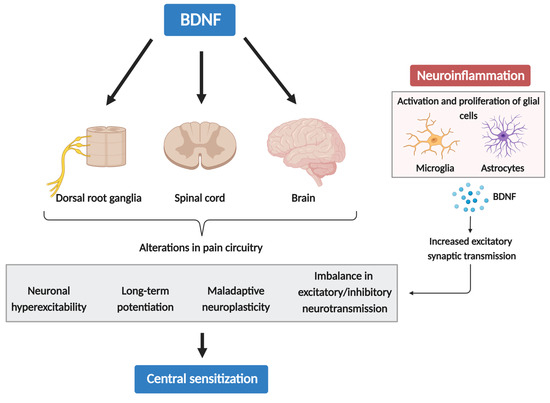 While acute inflammation is responsible for triggering acute pain sensations, neuroinflammation is supposed to play an important role in the chronification and persistence of pain [84,85]. This neuroinflammation is initiated by the activity-dependent release of glial activators, including neurotransmitters, chemokines, and proteases. This release stems from the central terminals of primary afferent neurons or is prompted by the disruption of the blood–brain barrier. Neuroinflammation is characterized by the activation of glial cells such as microglia and astrocytes, the infiltration of immune cells, vasculature changes, and an increased release of inflammatory and glial mediators like cytokines, chemokines, and BDNF [86]. These glial mediators can significantly regulate both excitatory and inhibitory synaptic transmission, thereby contributing to CS and enhanced chronic pain states. Moreover, glial mediators can further act on glial and immune cells to facilitate neuroinflammation through autocrine and paracrine routes [87].