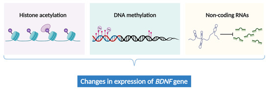 Chronic pain intricately involves abnormal gene expression within the neural cells responsible for processing nociceptive signals in the brain [152,153]. While genetic alterations offer a partial explanation for chronic pain, the emerging field of epigenetics provides a more nuanced and dynamic perspective by unraveling the gene expression patterns associated with chronic pain [154,155]. Recent studies revealed that epigenetic mechanisms, including histone acetylation [156], non-coding RNAs [156,157], and DNA methylation [127,158,159], can influence the expression of BDNF (Figure 2, Table 3). These epigenetic modifications may contribute to the pathogenesis and symptomatology of chronic pain.