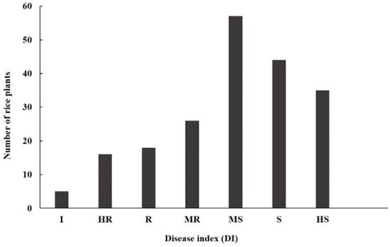 At the seventh to eighth stage of panicle development of the parents, F1, and F2 segregating population, mixed conidial suspension with a concentration of 1 × 106 mL−1 was injected into rice panicles. After inoculation, all rice plants were kept at 25/30 °C (night/day), covered with a sunshade net, and automatically sprayed with water for 2 min every 1 h to maintain an environment with 90–95% relative humidity (RH) for 3 d. The number of diseased panicles and diseased grains per panicle was investigated 21 days after inoculation. Each panicle was scored 21 d after inoculation based on a disease rating scale ranging from 0 to 9 (0 = absence of diseased grains per panicle, 1 = 1 diseased grain per panicle, 3 = 2–4 diseased grains per panicle, 5 = 5–8 diseased grains per panicle, 7 = 9–15 diseased grains per panicle, 9 = >16 diseased grains per panicle). The disease index (DI) was used to evaluate the resistance of rice to RFS. The DI was calculated from the disease rating scale using the following formula: DI = ∑ (Number of plants with disease rating × Disease rating)/(Total number of plants × Highest disease rating possible) × 100 []. The disease rating scale was estimated by the number of diseased grains per panicle. The evaluation criteria of resistance and susceptibility were as follows: immunization (I): disease index (DI) = 0; high resistance (HR): 0.0 < DI ≤ 5.0; disease resistance (R): 5.0 < DI ≤ 10.0; moderate resistance (MR): 10.0 < DI ≤ 20.0; moderate susceptibility (MS): 20.0 < DI ≤ 40.0; susceptibility (S): 40.0 < DI ≤ 60.0; and high susceptibility (HS): 60.0 < DI ≤ 100.0.