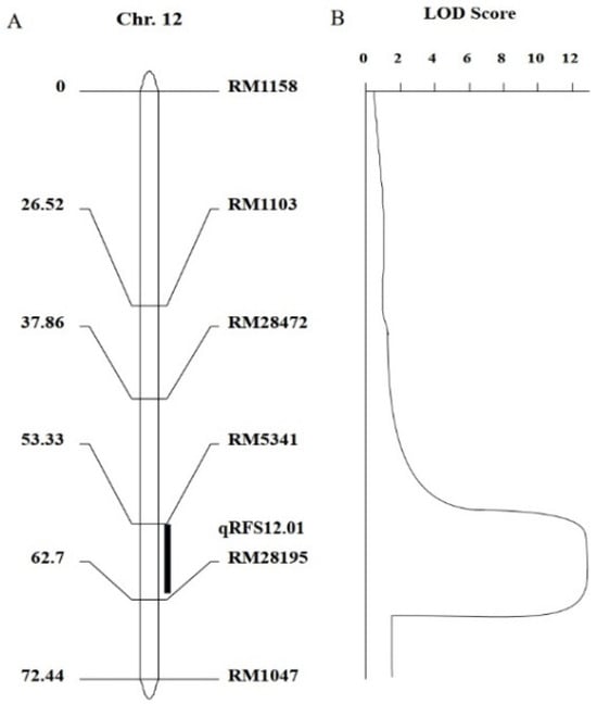 RFS is a rice disease with a wide incidence area that seriously affects the yield of rice after rice blast, rice sheath blight, and rice bacterial leaf blight []. Disease control is an important way to reduce rice yield loss. At present, the prevention and control measures of RFS mainly rely on fungicides. However, overreliance on fungicides will cause pathogens to develop resistance and pollute the environment []. Therefore, there is an urgent need for efficient, environmentally friendly, and economical disease management strategies. Breeding and planting disease-resistant cultivars are considered an economical and effective measure for reducing the damage caused by RFS. However, due to the late start of research on the inheritance of resistance to RFS and the molecular mechanisms of rice resistance to RFS, there are still few germplasm resources for resistance to RFS disease. IR77298-14-1-2::IRGC117374-1 is a highly resistant rice material identified from early germplasm resources [], but the inheritance mechanism of resistance is still unclear, and there are few reports about resistance genes in rice at home and abroad. In this study, we mapped the resistance QTL for RFS from the highly field-resistant rice IR77298-14-1-2::IRGC117374-1. This finding holds great value in elucidating the molecular basis of rice resistance to RFS.