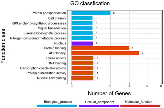 The combination of BSA-seq and SSR marker localization suggested that there were overlapping regions on chromosome 12 of the associated regions. To more accurately explore the genes related to RFS resistance, the overlapping region was selected as the final candidate region. The physical distance of the overlapping interval was 18.152–19.156 Mb, and the size of the region was 1.004 Mb, which was the region between SSR markers RM28195 and RM5341 (qRFS12.01), and contained 41 candidate genes, 22 of which were successfully annotated. These annotated genes fell into three main categories: biological processes, molecular functions, and cellular components (Figure 5).