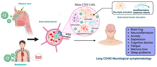 Regardless of the route of neuroinvasion, the virus can infect multiple cell types that express the ACE2 receptor, such as neurons, astrocytes, microglia, pericytes, endothelial cells, and oligodendrocytes promoting long COVID symptomatology [35,39]. However, CNS damage directly due to the neuroinvasiveness of SARS-CoV-2 does not seem to be the main mechanism in the pathophysiology of neurological symptoms. In this regard, systemic inflammation causes CNS inflammation through chemokines and other mechanisms, probably causing oligodendrocyte dysfunction, neurogenesis failure, axonal damage, and astrocyte changes [40]. Other mechanisms involved are the development of autoimmunity phenomena, thrombotic and microvascular damage, and reactivation of other infections. Additionally, hypoxic and metabolic issues are also present, especially in cases with severe acute COVID-19.