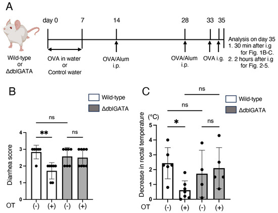 The experimental procedure is shown in Figure 1A. To induce oral tolerance, mice (7–9-week-old) were freely given sterile distilled water containing 4 mg/mL of ovalbumin (OVA; chicken albumin, Grade V; Sigma-Aldrich (St. Louis, MO, USA)) as drinking water for 7 consecutive days (oral treatment (OT) group). Control animals were given sterile distilled water (control group). On days 14 and 28, mice were immunized intraperitoneally (i.p.) with 100 μg OVA absorbed in 1 mg of aluminum hydroxide gel (Thermo Fisher Scientific, Waltham, MA, USA). On days 33 and 35, mice were challenged by intragastric gavage (i.g.) with 40 mg OVA in 200 μL of PBS using tubing. Thirty minutes after the last OVA challenge on day 35, food allergy was assessed by a decrease in rectal temperature and a diarrhea score determined on the following scale: 0: normal (normal stool), 1: minimal (soft stool), 2: slight (slightly wet and soft stool), 3: moderate (wet and unformed stool with moderate perianal staining of the coat), and 4: severe (watery stool with severe perianal staining of the coat).