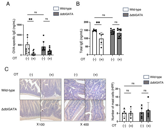 We also measured anti-OVA IgE levels in ΔdblGATA mice and wild-type mice seven days after final OVA sensitization. Oral administration of OVA prior to the sensitization reduced the levels of anti-OVA IgE and total IgE in wild-type mice but not in ΔdblGATA mice (Figure 2A,B). Mast cells are present in the gastrointestinal mucosa and are the primary effector cells of IgE-mediated allergic reactions to food [31]. Hence, we histologically analyzed the number of mast cells in the small intestinal mucosa seven days after the final OVA sensitization. As shown in Figure 2C, without oral administration of OVA prior to sensitization, there was no difference in the number of mast cells in the small intestinal mucosa between wild-type mice and ΔdblGATA mice. Under these conditions, the severity of food allergy (Figure 1) and anti-OVA IgE (Figure 2A) were comparable between wild-type mice and ΔdblGATA mice, suggesting that the mast cell degranulation capacity is not different between wild-type mice and ΔdblGATA mice. Moreover, with oral administration of OVA prior to sensitization, there was no difference in the number of mast cells in the small intestinal mucosa between wild-type and ΔdblGATA mice (Figure 2C). These results suggest that eosinophils are critical in the induction of oral tolerance, possibly via the reduction of antigen-specific IgE production.