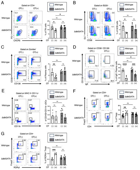 Eosinophils contribute to an increase in RORγt+ Tregs and attenuation of germinal center responses in mesenteric lymph nodes by oral tolerance induction. Similar to Figure 1A, ΔdblGATA mice and wild-type mice were freely given sterile water containing OVA (OT(+)) or control sterile water (OT(-)) for seven consecutive days, immunized i.p. with OVA/alum on days 14 and 28, and challenged i.g. with OVA on days 33 and 35. Two hours after the final challenge on day 35, mice were sacrificed, and cells from MLNs were analyzed using flow cytometry. (A) Representative dot plots of PD-1 vs. CXCR5 gated on CD4+ cells (left) and the frequencies of Tfh cells (CXCR5high PD-1high cells) in CD4+ cells (right). (B) Representative dot plots of GL7 vs. CD38 gated on B220+ cells (left) and the frequencies of GC B cells (GL7+ CD38− cells) in B220+ cells (right). (C) Representative dot plots of CD38 vs. CD138 gated on live cells (left) and the frequencies of plasma cells (CD38+ CD138+ cells) in live cells (right). (D) Representative staining of CD138 vs. IgE gated on CD38+ CD138+ cells (left) and the frequencies of IgE+ plasma cells (IgE+ cells) in CD38+ CD138+ cells (right). (E) Representative dot plots of CD103 vs. CD11b gated on I-A/I-E (MHC II)high CD11c+ cells (left) and the frequencies of CD11b− cDCs (CD103+ CD11b− cells) in live cells (right). (F) Representative dot plots of Foxp3 vs. CD4 gated on CD4+ cells (left) and the frequencies of Tregs (Foxp3+ CD4+ cells) in CD4+ cells (right). (G) Representative dot plots of Foxp3 vs. RORγt gated on CD4+ cells (left) and the frequencies of RORγt+ Tregs (Foxp3+ RORγt+ cells) in CD4+ cells (right). Data are compiled from three independent experiments, * p < 0.05, ** p < 0.01, *** p < 0.001, **** p < 0.0001. ns: not significant.