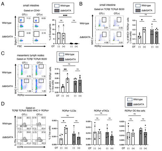 We then focused on RORγt+ APCs, a group of antigen-presenting cells recently identified in the gut that express high levels of RORγt and MHC II and induce RORγt+ Treg differentiation [13,14,15]. Oral administration of OVA prior to the sensitization increased the number of RORγt+ APCs, defined as TCRβ− TCRγδ− B220− MHC IIhigh RORγt+ cells as described previously [13], in the small intestine in wild-type mice but not in ΔdblGATA mice (Figure 4B). Similar results were obtained for RORγt+ APCs in MLNs (Figure 4C). RORγt+ APCs include subsets of group 3 innate lymphoid cells (RORγt+ ILC3s), extrathymic autoimmune regulator (AIRE)-expressing cells (RORγt+ eTACS), and RORγt+ DC-like cells [13,14,15]. We then analyzed RORγt+ APC subsets in MLNs. Oral administration of OVA prior to the sensitization increased the number of RORγt+ ILC3s (IL-7Rα+ CCR6+ cells) but not RORγt+ DC-like cells (IL-7Rα− CCR6− cells) or RORγt+ eTACs (IL-7Rα− CCR6+ cells) in wild-type mice, while oral administration of OVA prior to the sensitization did not increase any subsets in ΔdblGATA mice (Figure 4D). These results indicate that eosinophils promote RORγt+ ILC3s in oral tolerance induction.