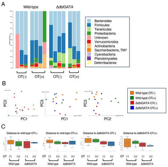 The gut microbiome in the intestine is crucial for the differentiation of RORγt+ APCs [13,14,15]. Since eosinophils are especially numerous in the small intestinal mucosa, we analyzed the microbiome in the small intestine in ΔdblGATA mice. We collected small intestinal contents from wild-type mice and ΔdblGATA mice and then performed 16s rRNA gut microbiota analysis (Figure 5A). There was no significant difference in microbiota composition of contents between wild-type mice and ΔdblGATA mice (Figure 5B,C). Moreover, no significant differences were found in the microbiota, with or without oral administration of OVA prior to the sensitization (Figure 5B,C). These results suggest that the microbiome was not significantly involved in the eosinophil-mediated increase of RORγt+ APCs in oral tolerance induction.