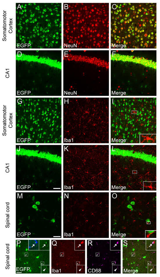Next, we wanted to know whether microglia express BDNF. For this, we used Iba1 antibody to label microglia in Bdnf2A-Cre/+;EGFP-L10a/+ mice. We examined BDNF expression in the somatomotor cortex (MO), hippocampal CA1, and spinal cord because microglia in these regions have been suggested to express BDNF [6,7]. Surprisingly, we did not observe EGFP expression in the nuclei of Iba1+ microglia in the MO, hippocampal CA1, or the spinal cord of 4-month-old Bdnf2A-Cre/+;EGFP-L10a/+ mice, indicating that homeostatic microglia do not express BDNF under physiological conditions (Figure 1G–O). However, we did observe EGFP puncta in some microglial cell bodies and processes, outside microglial nuclei (Figure 1P–S). Immunostaining of CD68, a microglial lysosomal marker, showed that the EGFP puncta are always colocalized with CD68 (Figure 1P–S). This indicates that these EGFP signals in microglia come from BDNF-expressing cells engulfed by microglia and are not from BDNF expression in microglia.
