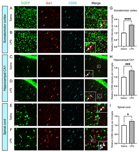 Statistical analyses were performed using Prism 10 for macOS. Unpaired t-test was used to compare relative CD68 intensity per microglia in saline control mice and in LPS-injected mice. The minimal level of significance was set at p < 0.05.