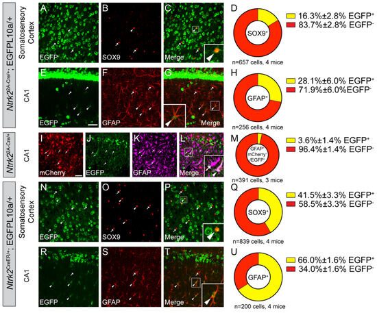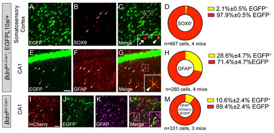 Astrocytes have been shown to predominantly express TrkB.T; however, whether astrocytes also express TrkB.FL is not as clear. To investigate the expression of TrkB.FL in astrocytes, we quantified the colocalization of EGFP and astrocyte markers, SOX9 and GFAP, in Ntrk22A-Cre/+;EGFP-L10a/+ mice. Our analyses showed that a small portion of astrocytes (16.3% in SS and 28.1% in hippocampal CA1) express TrkB.FL at some point during the lifespan of the mice (Figure 8A–H). To test whether astrocytes in adult mice express TrkB.FL, we injected the Cre-dependent mCherry-to-EGFP color switch AAV to the hippocampus of 2-month-old Ntrk22A-Cre/+ mice [25]. Further, 92.7% of astrocytes were transduced by the AAV virus, and only 3.6% of the transduced cells expressed Cre (Figure 8I–M). These results suggest that only a very small subset of astrocytes express TrkB.FL in adult mice. Because this number is smaller than the 18.0% seen in Ntrk22A-Cre/+;EGFP-L10a/+ mice, the two non-exclusive possibilities discussed before may also apply here: (1) some astrocytes express TrkB.FL during development and stop the expression in adulthood; (2) there are several small subsets of mature astrocytes that transiently express TrkB.FL at different times.