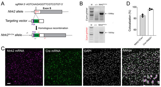 To label cells that express TrkB.FL, we generated the Ntrk22A-Cre/+ mouse strain, which expresses Cre recombinase in TrkB.FL-expressing cells. We employed the CRISPR/Cas9 technology to insert the P2A-Cre sequence into the Ntrk2 locus immediately before the stop codon for the TrkB.FL (Figure 5A). Mice with the insertion were identified using genomic DNA PCR (Figure 5B). There was a high colocalization between Cre mRNA and Ntrk2 mRNA for TrkB-FL in the cortex of Ntrk22A-Cre/+ mice (Figure 5C,D), validating the allele.