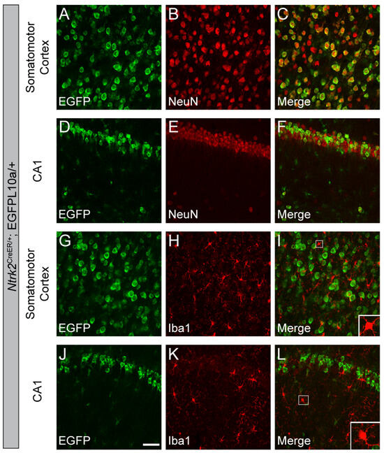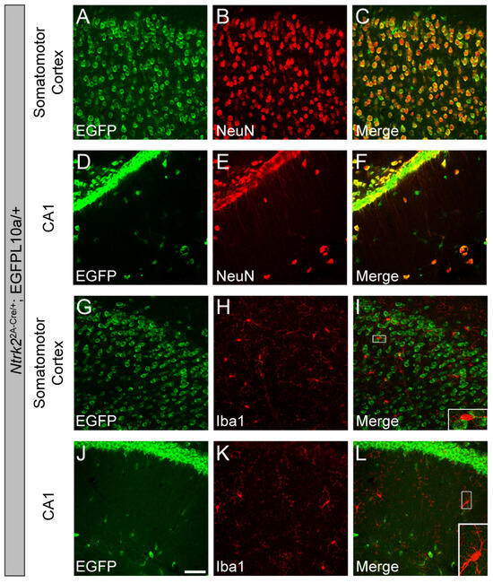 Microglia do not express TrkB.FL. (A–F) Colocalization of NeuN+ neurons and EGFP in the MO and CA1 of Ntrk22A-Cre/+;EGFP-L10a/+ mice. (G–L) Homeostatic microglia do not express EGFP in the MO and CA1 of Ntrk22A-Cre/+;EGFP-L10a/+ mice. Inserts in (I,L) are enlarged 3×. Scale bar = 50 μm. n = 4 mice.