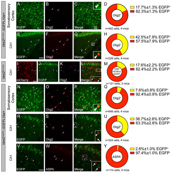 OPCs express TrkB.FL and TrkB.T in adult mice. (A–G) Immunostaining of Olig2 in the SS (A–C) and CA1 (E–G) of Ntrk22A-Cre/+;EGFP-L10a/+ mice, and (D,H) quantification of colocalization (mean ± SEM). (I–M) Immunostaining of Olig2 in the CA1 of adult Ntrk22A-Cre/+ mice injected with the mCherry-to-EGFP color switch AAV, and quantification of the colocalization of GFAP and EGFP (mean ± SEM). (N–U) Immunostaining of Olig2 in the SS (N–P) and CA1 (R–T) of Ntrk2CreER/+;EGFP-L10a/+ mice, and (Q,U) quantification of colocalization (mean ± SEM). (V–Y) Immunostaining of ASPA in the CA1 (V–X) of Ntrk2CreER/+;EGFP-L10a/+ mice, and (Y) quantification of colocalization. Inserts in (C,G,P) are enlarged 3×, and inserts in (L,T,X) are enlarged 2×. Scale bars = 50 μm. Arrowheads denote EGFP-expressing oligodendrocytes. Arrows denote oligodendrocytes that do not express EGFP.