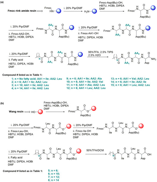 Fmoc-protected amino acids—Fmoc-Ile-OH (CAS No. 71989-23-6, 98%), Fmoc-Ala-OH (CAS No. 35661-39-3, 99.92%), Fmoc-Val-OH (CAS No. 68858-20-8, 99.56%), Fmoc-Leu-OH (CAS No. 35661-60-0, 99.78%), and Fmoc-Asp(OtBu)-OH (CAS No. 71989-14-5, 99.92%)—and fatty acids, namely n-octanoic acid (CAS No. 124-07-2, 99.56%) and tetradecanoic acid (CAS No. 544-63-8, 99%), were purchased from BLD Pharmatech (Cincinnati, OH, USA) and used without further purification. Lauric acid (CAS No. 143-07-7) and palmitic acid (CAS No. 57-10-3, 99%) were purchased from Sigma Chemicals (St. Louis, MO, USA). Fmoc-rink amide resin (0.57 mmol/g, 100–200 mesh); Wang resin (0.9 mmol/g, 100–200 mesh); the Kaiser test kit (Catalog no. KGZ001); O-benzotriazole-N, N, N′; and N′-tetramethyluronium-hexafluoro-phosphate (CAS No. 94790-37-1) were purchased from Aapptec, LLC (Louisville, KY, USA). Hydroxybenzotriazole (HOBt, CAS No. 2592-95-2, 98.75%) was purchased from Apexbio (Houston, TX, USA). Trifluoroacetic acid (TFA; CAS No. 76-05-1, 99%) was purchased from Honeywell Research Chemicals (Muskegon, MI, USA). Piperidine (CAS No. 110-89-4, 99%) was purchased from Sigma-Aldrich LLC (St. Louis, MI, USA). N, N-diisopropylethylamine (DIPEA; CAS No. 7087-68-5, 99%) was purchased from TCI America (Portland, OR, USA). N, N-dimethylformamide (DMF; CAS No. 68-12-2), diethyl ether (DE; CAS No. 60-29-7), and dichloromethane (DCM; CAS No. 75-09-2) were obtained from Thermo-Scientific (Ward Hill, MA, USA).