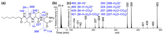LC-MS/MS of caprylic acid–isoleucine–leucine–aspartic acid amide conjugate [C8 acid-ILD-NH2(2)]. (a) Deprotonated molecular structure of C8 acid-ILD–NH2(2) and interpretative illustration of its MS/MS fragment ions. (b) A typical C18 reversed-phase chromatogram from LC-MS/MS analysis of (2). (c) LC-MS/MS spectrum of (2) and interpretation of its MS/MS fragment ions (right). The LC-MS/MS system consisted of an Agilent 1100 LC and QTRAP 6500+ quadruple-linear trap mass spectrophotometer with electrospray ionization.