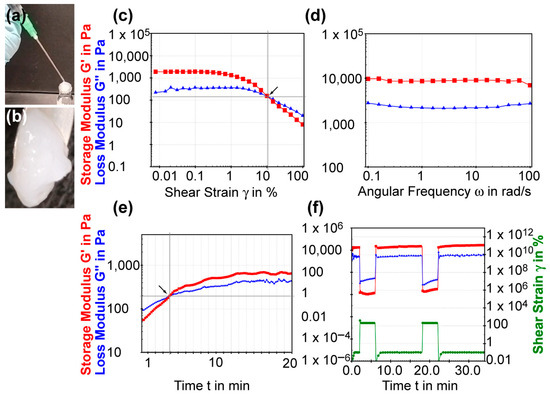 The amplitude sweep test of the C8-ILD-NH2(2) hydrogel showed that it had a larger storage modulus G′ than loss modulus G″ in the limit of the linear viscoelastic region (on the left of the chart in Figure 5c), indicating the presence of an elastic gel structure. When the shear strain increase just surpassed 10.56%, the G′ and G″ curves crossed over each other (crossover point G′ = G″), so that G′ < G″, indicating a transition from the gel state to a viscous liquid state. Thus, the shear strain that promotes gel flow (i.e., the flow point) is 10.56%. The frequency sweep test (0.1–100 rad/s) of the C8-ILD-NH2(2) hydrogel at the 1% strain showed G′ (~10,000 Pa) > G″ (2–3 kPa), indicating a gel status under this condition (Figure 4d). It also showed that G″ and G′ readouts were independent of the frequency, reflecting the high stability of hydrogel (2). Hydrogels formed from 1%, 1.5%, and 3% C8-ILD-NH2(2) in PBS in our pilot study (Table 1, Figure 4) showed elastic moduli comparable to those of the dermis or skin (0.5–18 kPa) [39,40], supporting the suitability of our hydrogels for wound treatment. The isothermal time-sweep curing test for gel formation (Figure 5e) from the G′ < G″ sol state to G′ > G″ gel state showcased the gel formation of (2) and a crossover point at 3.87 min (G′ = G″) under a constant 10% shear strain (amplitude) and constant 1 Hz frequency.
