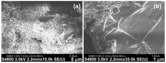 Surface structures of the fibrous networks from freeze-dried C8-ILD-NH2(2) hydrogel were observed using field emission scanning electron microscopy at different magnifications. Secondary electrons (SEs) were detected using an upper detector (U), with a working distance of 2.2 mm and acceleration voltage of −3.0 kV. (a) Image at ×10,000 (b) Image at ×35,000.