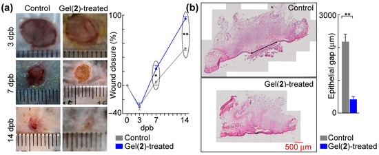 Notably, at 3 dpb, the wound sizes in both groups were actually larger than the initial size (6 mm in diameter) of the burn wounds created at 0 dpb, whereas the closure (%) at 3 dpb was negative (Figure 7a). The 6 mm heated rod used for burning cauterized/destroyed the 6-mm-diameter full-thickness skin underneath it; however, it also injured the tissue around its perimeter, causing the burn-wound margin to expand at 3 dpb, even though the necrotic tissue created by burning had already been debrided by conducting the 6 mm diameter full-thickness excision at 2 dpb. No differences were noted in wound size or closure at 3 dpb between the hydrogel-treated and control groups, which suggests that the hydrogel might be unable to rescue all damaged tissue or cells that were already destined to die. However, the promotion of wound closure and re-epithelialization by the hydrogel (Figure 7) may reflect its action in promoting growth from surrounding non-injured tissues and cells and/or its ability to partially rescue heat-injured tissue/cells [30,31]. The hydrogel may also affect wound vascularization, inflammation, and late-phase remodeling [30,31]. The hydrogels reported here may also have effects on bacteria and other microbes [4]. These possibilities are beyond the scope of this paper and will be examined in our future studies.