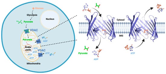 Schematic representation of VDAC function in the cell. VDAC is located in the Outer Mitochondrial Membrane where it is the major pathway for exchange of metabolites and ions between the mitochondria and the cytosol. Strands 5–9 were omitted to show the interior of the barrel. IMS, intermembrane space. Prepared with Biorender.