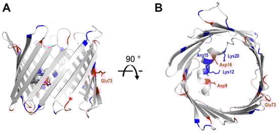 Charge distribution on VDAC. Cartoon representation of mouse VDAC-1 (PDB 3EMN) as seen in the plane of the membrane (A) and from the intracellular side (B). Positively charged residues are highlighted in blue and negatively charged residues in red. Side change are shown as stick representation.