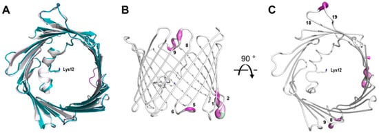 Overlay of PDB 3EMN (white) and the mVDAC-1 RT structure (teal) (A). Cartoon representation of mVDAC-1 RT as seen in the plane of the membrane (B) and from the intracellular side (C). The structure is colored according to the R.M.S.D. between mVDAC-1 RT and 3EMN. Regions with a high R.M.S.D. are shown in purple. The sidechain of residue Lys-12 is shown as a stick representation and the β-strands are numbered.