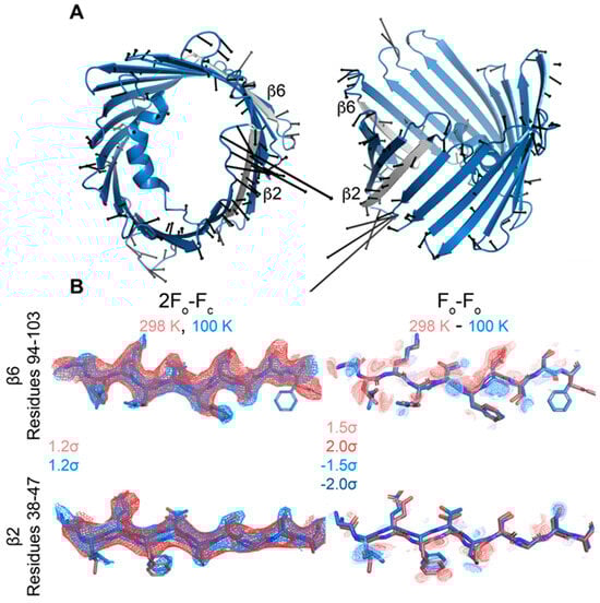 The beta barrel deforms slightly with temperature. (A) Side and top views of displacement vectors pointing from Cα positions in the cryo model to those in the room-temperature model. The β2 and β6 strands are colored gray. Only displacements larger than 0.5 Å are shown, magnified 5× for clarity. (B) 2Fo-Fc and Fo-Fo difference density for residues 94–103 of β6 and residues 38–47 of β2. Maps are contoured to the indicated σ-levels. 2Fo-Fc maps are carved to within 2 Å of the model, and difference maps are carved to within 1.8 Å of the model.