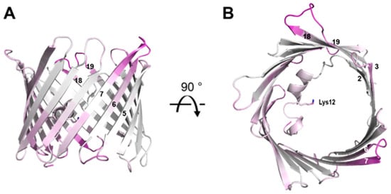 Overview of the mVDAC1 RT structure. The structure is colored according to the difference in the B-factor between the RT structure and PDB 3EMN. Regions with a small difference (indicating pre-existing high B-factors) are shown in purple. The residue Lys-12 sidechain is shown as a stick representation and β-strands are numbered. (A) View in the plane of the membrane. (B) View from the cytosolic side.
