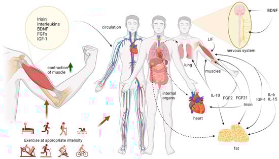 Myokines are involved in the regulation of exercise on health. Studies have found that exercise-induced myokines can produce a series of metabolic changes, which contribute to the prevention and treatment of a variety of chronic diseases [45]. Therefore, myokines may be the physiological basis for regulating and protecting body functions through exercise training (Table 1 and Figure 2). The regulation of myokine secretion by exercise can be affected by the mode, intensity, and duration of exercise [8]. It is very important to understand the regulatory effects of exercise on myokines.