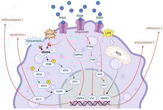 In addition, irisin was able to inhibit macrophage apoptosis. Zheng et al. found that irisin inhibited oX-LDL-induced nuclear translocation of transcription factor 6 (ATF6) and reversed clathrin-induced up-regulation of C/EBP homologous protein (CHOP), protein kinase RNA-like ER kinase phosphorylation (p-PERK), and eukaryotic translation initiation factor 2α phosphorylation (p-elF2α). It also up-regulated the expression of apoptosis inhibitor BCL-2, which attenuated macrophage apoptosis in vitro [133]. Not only that, irisin also improved macrophage infiltration. In a mice model of atherosclerosis induced with nicotine, nicotine increased macrophage infiltration and aggravated atherosclerosis. In contrast, after treatment with irisin, irisin inhibited macrophage infiltration by activating PTEN via integrin αVβ5 receptor, thereby inhibiting PI3K and promoting the up-regulation of the cell cycle protein-dependent protein kinase inhibitor P27. Thus, irisin significantly ameliorated nicotine-induced macrophage infiltration and inhibited the progression of atherosclerosis via the integrin αVβ5/PI3K/P27 pathway [134]. In summary, irisin can enhance the function of immune cells, especially macrophages, which is beneficial for the recovery of many chronic diseases.
