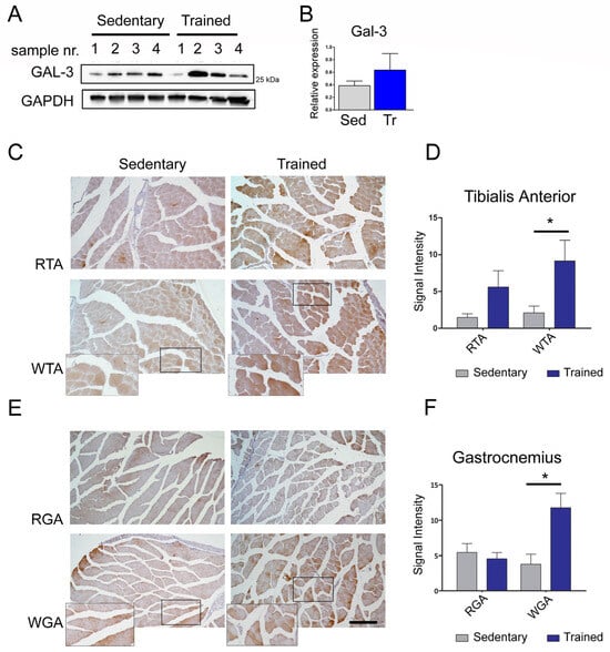 Endurance training increases Gal-3 expression in muscle fibers of type IIB. (A,B) The tibialis anterior muscles from the sedentary (Sed) and trained (Tr) mice groups were analyzed to determine the intracellular level of Gal-3 expression. The bar graph represents the average OD of the samples of the two groups, normalized to the corresponding values of GAPDH. Original images can be found in Supplementary File 1. (C,D) A Gal-3 immunohistochemical analysis of the red (RTA) and white fibers (WTA) of the tibialis anterior muscles from the sedentary and trained mice groups with the images’ signal intensity quantification. (E,F) The Gal-3 immunohistochemical analysis of the red (RGA) and white fibers (WGA) of the gastrocnemius muscles from the sedentary and trained mice groups, with the images’ signal intensity quantification. Enlarged areas are present within the most significant panels. Bars 250 micron. A statistically significant increase in Gal-3 expression was seen in the white fibers of both muscle types in the trained mice group (n = 3, * p < 0.05), when compared to the group of sedentary mice.