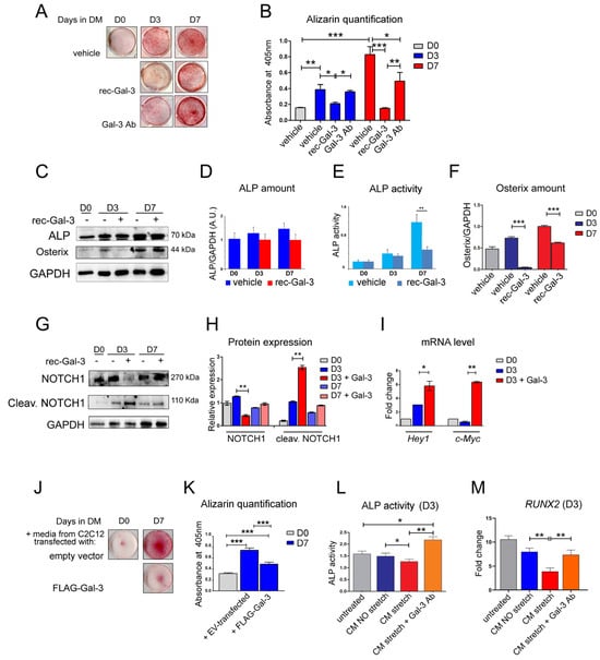 To investigate the effects elicited by the circulating Gal-3 in osteogenesis, MC-3T3 osteoblast precursors, after having proliferated (D0) and differentiated in the osteogenic medium for 3 and 7 days (D3 and D7), were treated with a recombinant soluble form of Gal-3 (rec-Gal-3) or another vehicle (Figure 3A–I). At the end of the treatment, the cells were subjected to alizarin red staining, which is generally used as a marker of bone differentiation. Figure 3A showed that supplementation with rec-Gal-3 reduced osteogenic differentiation after 3 and 7 days. Strikingly, the inhibitory effect of the rec-Gal-3 addition was counteracted by the administration of a neutralizing antibody against Gal-3 (Figure 3A,B). The addition of rec-Gal-3 to the culture medium of osteoblasts did not modify the expression of bone alkaline phosphatase (b-ALP) (Figure 3C,D), whereas it inhibited its activity, as monitored by an ALP activity assay (Figure 3E). Our findings obtained from the differentiated MC-3T3 osteoblast progenitors indicated that the supplementation of the differentiation medium with Gal-3 counteracted the expression of Osterix, which was instead promoted during the normal differentiation of these cells (Figure 3C–F). Among the signaling pathways modulated during osteogenesis, the activation of the Notch receptor is the most typical [2,3,21]. The Notch signaling pathway inhibits osteoblast differentiation [30], and since our results showed that Gal-3 impairs osteoblast differentiation, we analyzed the expression and activity of Notch (Figure 3G–I). The western blot analysis shown in Figure 3G demonstrated that the supplementation of recombinant Gal-3 into the differentiation medium of MC-3T3 osteoblast progenitors reduced the level of the expression of Notch1 during the early steps of differentiation (compare lanes “D3 and D3 + rec-Gal-3” with lanes “D7 and D7 + rec-Gal-3”). The inhibitory effect of Gal-3 on Notch1 expression was evident by the third day of differentiation, while it was restored by 7 days of differentiation. In parallel, Gal-3 was able to strongly induce cleaved Notch1 (Figure 3G,H) that, in turn, activated the transcription of Hey1 and c-Myc, two of the most known Notch1 target genes (Figure 3I). A similar trend of the modulation of the Notch level of expression has already been reported by Nakashima et al. [21,22,23,24,25,26,27,28,29,30]. In that paper, the authors suggest that Gal-3 is able to impair osteoblast differentiation by activating Notch signaling during the first days of osteogenetic induction. To confirm these considerations and further define if muscular Gal-3 has a role in the early osteogenetic processes, the supernatants of muscle cells that were overexpressing Gal-3 were next assayed for their ability to modulate the differentiation of osteoprogenitor cells. Thus, MC-3T3 osteoblast progenitors were induced to differentiate in a medium conditioned with the supernatant of Gal-3-overexpressing C2C12 cells, or, as a control, with that one from empty vector (ev)-transfected-cells. Osteoblast differentiation was hence followed by alizarin red staining. The results shown in Figure 3J,K revealed that matrix mineralization was reduced by supplementation with the supernatant from the Gal-3-overexpressing C2C12 cells, but not by the supplement added to the control sample (FLAG-Gal-3 vs. empty vector) (Figure S3). Finally, to mimic the physiological condition, the MC-3T3 osteoblast progenitors were differentiated for three days in a medium conditioned with the supernatant of the C2C12 cells that were exposed to mechanical strain for 6 h (CM Stretch). The CM medium was able to reduce ALP activity and thus osteoblast differentiation compared to the MC-3T3 osteoblast progenitors differentiated in a medium conditioned with the supernatant of the unstrained C2C12 cells (CM NO Stretch) (Figure 3L). The addition of a neutralizing antibody against Gal-3 (CM Stretch + Gal-3 Ab) was able to stimulate the ALP activity, confirming that the inhibitory effect on ALP activity is specifically due to the increased presence of Gal-3 in the culture medium, released by the C2C12 cells as a consequence of strain (Figure 3L). An RT-qPCR analysis of these samples revealed that the activation of the RUNX2 gene, which is a marker of osteogenic processes, decreased upon supplementation with the supernatant of the strained C2C12 cells, while it was restored by the addition of anti-Gal-3 antibody to the same medium (Figure 3M).