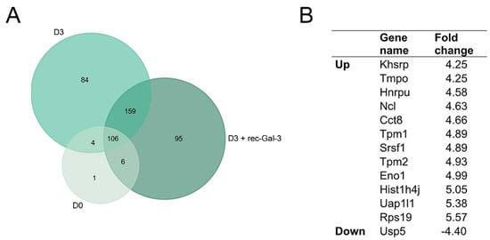 Rec-Gal-3 modulates the expression of proteins with fundamental cellular functions during the differentiation of MC-3T3 osteoprogenitor cells. (A) A Venn diagram showing the proteins identified by an LC-MS analysis. We identified 117 proteins on D0, 366 on D3, and 353 on D3 + rec-Gal-3. (B) The list of proteins up- or down-regulated in the MC-3T3 cells after 3 days of differentiation with recombinant Gal-3, compared to D3. Only the proteins identified with a fold increase ≥ 4 were reported.