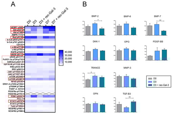 The heat map shown in Figure 5A demonstrated that at basal conditions, the Akt/mTOR pathway is activated during both the early (D3) and the middle (D7) phases of osteogenic differentiation. Interestingly, the supplementation of rec-Gal-3 in the differentiation medium did revert the activation of the Akt/mTOR pathway during the early phase of osteogenesis (D3), but not after 7 days of differentiation (D7).