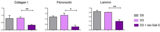 rec-Gal-3 affects the ability of differentiated osteoblasts to interact with ECM components. The evaluation of the ability of the MC-3T3 cells maintained in a growth medium (D0), differentiated for 3 days (D3) with or without recombinant Gal-3 (D3 + rec-Gal-3) to interact with the typical components of the extracellular bone matrix (Collagen I, Fibronectin, Laminin) through the “ECM adhesion assay” (n = 2, * p ≤ 0.05; ** p ≤ 0.01).