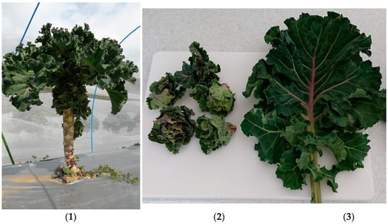 Petit vert (scientific name: Brassica oleracea var. gemmifera DC. × Brassica oleracea var. acephala DC.). (1) Petit vert. (2) Side shoots. (3) Leaf.
