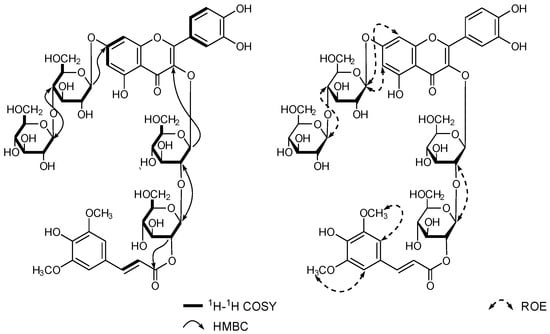 The molecular formula for new compound 2, C50H60O31, was established based on HR-ESI-MS [m/z: 1155.3058 [M-H]−]. The aglycone of compound 2 was identified as quercetin based on observations of fifteen carbon signals, including twelve aromatic carbon signals (δC 164.1, 162.2, 157.3, 149.8, 145.9, 123.3 × 2, 117.2, 116.1, 107.5, 100.6, and 95.4), two olefin carbons (δC 157.5 and 135.0), and one carbonyl carbon (δC 179.1), and AM-type aromatic protons [δH 6.37 (1H, d, J = 2.0 Hz) and 6.34 (1H, d, J = 2.0 Hz)] derived from the A-ring and AMX-type aromatic proton signals [δH 7.50 (1H, d, J = 2.0 Hz) 7.45 (1H, dd, J = 8.5, 2.0 Hz) and 6.88 (1H, d, J = 8.5 Hz)] derived from the B-ring in 13C and 1H NMR spectroscopic data. Moreover, in the 13C and 1H NMR spectra of compound 2, four anomeric carbon and proton signals of β-D-glucopyranosyl groups were observed at δC 96.9, 98.4, 101.2, 104.5, and δH 6.18 (1H, d, J = 8.0 Hz), 5.24 (1H, d, J = 8.0 Hz), 5.13 (1H, d, J = 8.0 Hz), and 4.48 (1H, d, J = 8.0 Hz) together with signals due to one trans-sinapoyl group [δC 168.6, 148.7 × 2, 146.6, 138.7, 125.9, 115.9, 105.5 × 2, 56.2 × 2 and δH 7.30 (1H, d, J = 16.0 Hz), 6.23 (1H, s) × 2, 6.09 (1H, d, J = 16.0 Hz), 3.59 (3H, s)×2]. These components of compound 2 were confirmed by alkaline and acid hydrolysis. 13C and 1H NMR signals were assigned (Table 1 and Table 2) based on the results of two-dimensional (2D)-NMR [1H-1H correlation spectroscopy (COSY), 1H-detected heteronuclear single-quantum correlation spectroscopy (HSQC), and 1H-detected hetero-nuclear multiple-bond connectivity (HMBC)] measurements. In addition, the HMBC experiment provided information on sugar and ester linkages. 3JCOCHs were observed between C-3 of the aglycone (δC 135.0) and H-1 of β-D-glucopyranose (δH 6.18), C-2 of β-D-glucopyranose (δc 82.0), H-1′ of β-D-glucopyranose (δH 5.24), C-7 of the aglycone (δC 164.1), H-1″ of β-D-glucopyranose (δH 5.13), C-4″ of β-D-glucopyranose (δc 80.1), and H-1‴ of β-D-glucopyranose (δH 4.48). These sugar linkages were also indicated by the results of a rotating frame nuclear Overhauser effect correlation spectroscopy (ROESY) experiment (Figure 2). Moreover, the acylation shift of the H-2′ signal of β-D-glucopyranose (δH 4.93) suggested that the sinapoyl group was attached at C-2′ of β-D-glucopyranose, which was supported by the results of the HMBC experiment. Therefore, compound 2 was identified as quercetin 3-O-β-D-[2-O-3,5-dimethoxy-4-hydroxy-(E)-cinnamoyl]-glucopyranosyl-(1→2)-β-D-glucopyranoside-7-O-β-D-glucopyranosyl-(1→4)-β-D-glucopyranoside.
