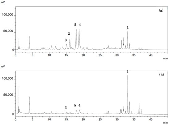 HPLC profiles of MeOH extracts from Petit vert leaf (a) and Petit vert side shoots (b). HPLC conditions [column: Cosmosil 2.5Cholester (2.5 µm), i.d. 3.0 × 100 mm (NACALAI TESQUE, INC.); mobile phase: A 0.1%TFA in water, B CH3CN, gradient, 0–20 min: 6–11% B linear, 20–36 min: 11–27% B linear, 36–45 min: 27% B; and flow rate: 0.75 mL/min; Detection: UV 330 nm; [Column temperature: 40 ℃].