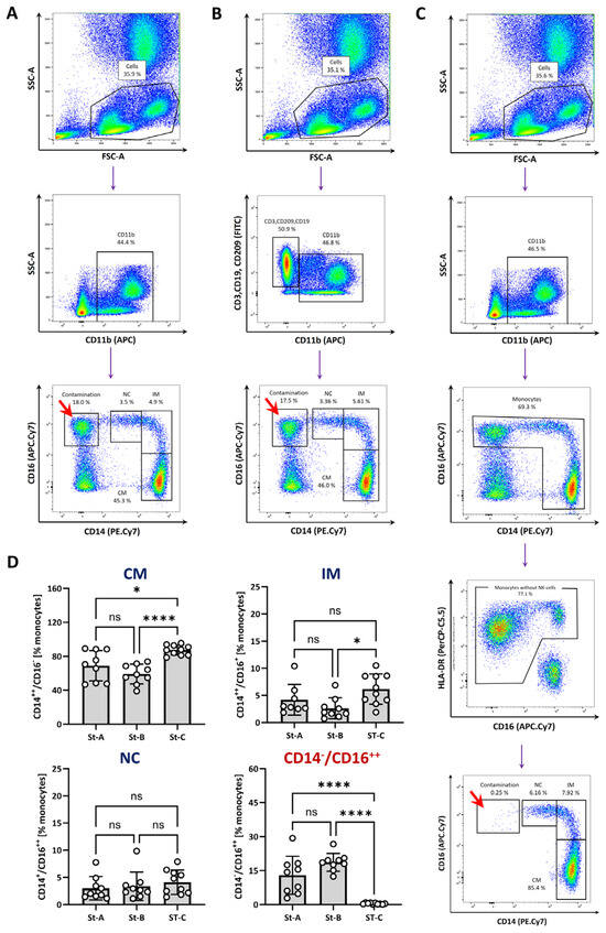 Antibody staining and gating strategies for identification of monocyte subsets. Human whole blood was obtained from healthy volunteers, erythrocytes were lysed and cells were stained with (A) CD11b-APC, CD14-PE.Cy7, CD16-APC.Cy7 (strategy A; ST-A); (B) CD11b-APC, CD14-PE.Cy7, CD16-APC.Cy7 and CD3-FITC, CD19-FITC, CD209-FITC (strategy B; ST-B); (C) CD11b-APC, CD14-PE.Cy7, CD16-APC.Cy7, HLA-DR-PerCP.Cy5.5 (strategy C; ST-C). Blood cells were additionally stained with DAPI (4′,6-Diamidin-2-phenylindol) to exclude dead cells (DAPI+) from the analysis (Figure S2). Displayed are pseudo-colour plots that indicate the gating strategy for the identification of monocyte subtypes based on the expression levels of CD14 and CD16. CM—classical monocytes, IM—intermediate monocytes, NC—non-classical monocytes. (D) Quantitative analysis of monocyte subset (% of monocytes for each subset and the CD16+/CD14− contamination of the monocyte population; marked by red arrows). Mean ± SD are shown; n = 9–10. Normality was tested using the Shapiro–Wilk test and variability with Levene’s test. Differences between the groups were analysed by a one-way ANOVA followed by Tukey’s multiple comparisons test. Statistical significance: ns— not significant, * p < 0.05, **** p < 0.0001. There were 12 healthy volunteers (2 × male, 10 × female; 22–28 years, median: 23 years). The complete gating for identification of monocyte subsets by strategies A–C is shown in Supplementary Figure S2.