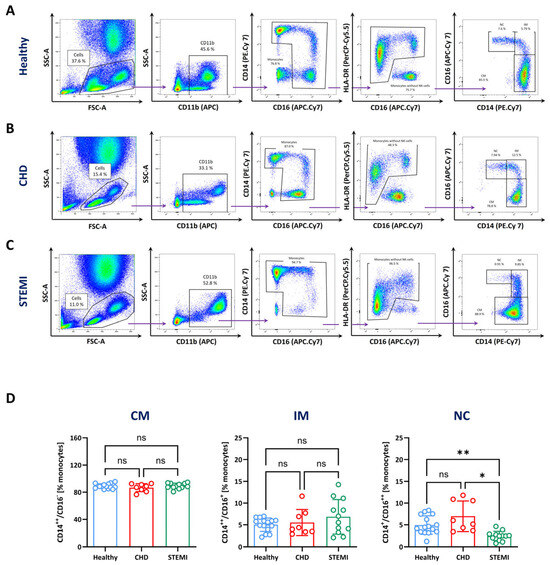 Analysis of monocyte subsets in CHD and STEMI patients. Blood samples derived from healthy volunteers (A, blue), patients with stable coronary heart disease (CHD, red) (B) and patients with ST-elevation myocardial infarction (STEMI, green) (C) were stained for CD11b, CD14, CD16 and HLA-DR to identify monocyte subsets. Displayed are pseudo-colour plots that show the gating strategy (strategy C) and the identification of the monocyte subtypes based on the expression of CD14 and CD16. (D) Quantitative analysis of the relative amount of monocyte subsets (CM—classical, IM—intermediate, NC—non-classical) in varying conditions. Data are mean values ± SD of n = 10–15. Normality was tested using the Shapiro–Wilk Test and variability with Levene’s test. Differences between the groups were analysed by a one-way ANOVA followed by Tukey’s multiple comparisons test. Statistical significance: ns—not significant, * p < 0.05, ** p < 0.01. There were 15 healthy controls (3 × male, 12 × female; 22–33 years, median: 24 years), 10 patients with CHD (5 × female, 5 × male; 52–86 years, median: 64 years) and 12 patients with STEMI (1 × female, 11 × male; 40–78 years, median: 60.5 years). (The complete gating strategy for the identification of monocyte subsets is shown in Supplementary Figure S6).