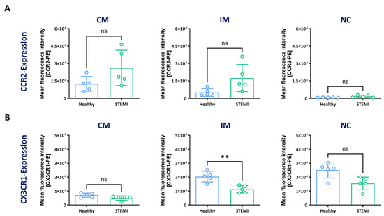 Cell surface expression of CCR2 and CX3CR1 in monocyte subsets. Blood samples were derived from healthy volunteers and from patients one day after ST-elevation myocardial infarction (STEMI). Cells were stained with antibodies against CD11b, CD14, CD16 and HLA-DR (strategy C) to identify monocyte subsets. Cells were then additionally incubated with either anti-CCR2 or anti-CX3CR1 antibodies. Quantitative analysis of CCR2 (A) or CX3CR1 (B) expression in monocyte subsets of healthy donors (blue) and patients with STEMI (green). Data are mean values ± SD of n = 5 individual experiments. Normality was tested using the Shapiro–Wilk test. Differences between the groups were analysed by an unpaired two-tailed t-test with or without Welch correction or a Mann–Whitney test. Statistical significance: ns— not significant, ** p < 0.01. There were 5 healthy controls (4 × female, 1 × male; 22–27 years, median: 24 years) and 5 patients with STEMI (5 × male; 59–68 years, median: 63 years).
