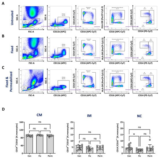 Identification of monocyte subsets after fixation and permeabilisation. Blood was derived from healthy volunteers and cells were stained with antibodies against CD11b, CD14, CD16 and HLA-DR for monocyte identification. Afterwards, cells were left untreated ((A), upper panel), fixed at room temperature for 25 min ((B), middle panel) or fixed and permeabilised (20 min at room temperature) ((C), lower panel). (D) Quantitative analysis of the relative amount of monocyte subsets (CM—classical, IM—intermediate, NC—non-classical) after fixation (Fix) and permeabilisation (Perm) of untreated control cells (Con). Normality was tested using a Shapiro–Wilk test and variability with Levene’s test. Differences between the groups were analysed by a one-way ANOVA followed by Tukey’s multiple comparisons test. Data are mean values ± SD of n = 9–11 (9 × female, 2 × male; 22–27 years, median: 24 years). Statistical significance: ns—not significant, * p < 0.05.